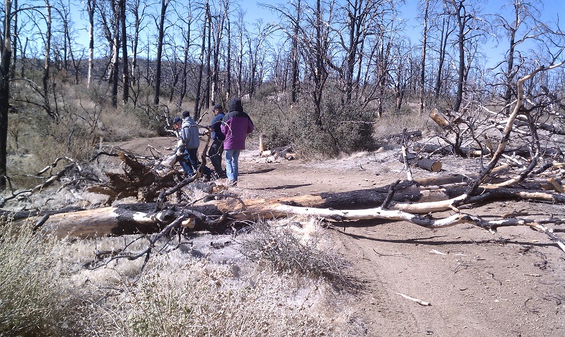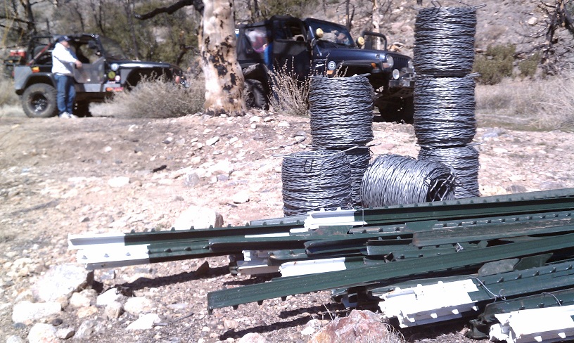 Met up with 2 jeeps from point mugu 4x4 club and went to the ranger station to meet the OHV program manager for the Los Padres National Forest. Resigned our Adopt-A-Trail agreement for Miller trail. Went out to the ranger supply yard and loaded my jeep with as many T-posts as I could carry. Probably had around 70 strapped down on my rack. more than I should have, but needed to make the trip worth while! Made my heep really tippy. The 2 jeeps from Point Mugu loaded down with wire spools and some t-posts.. The ranger gave us the code and keys to the gates and we took off. Made pretty good time, although we did have to clear about 8 trees from the trail... luckily I had Gregs chain saw.