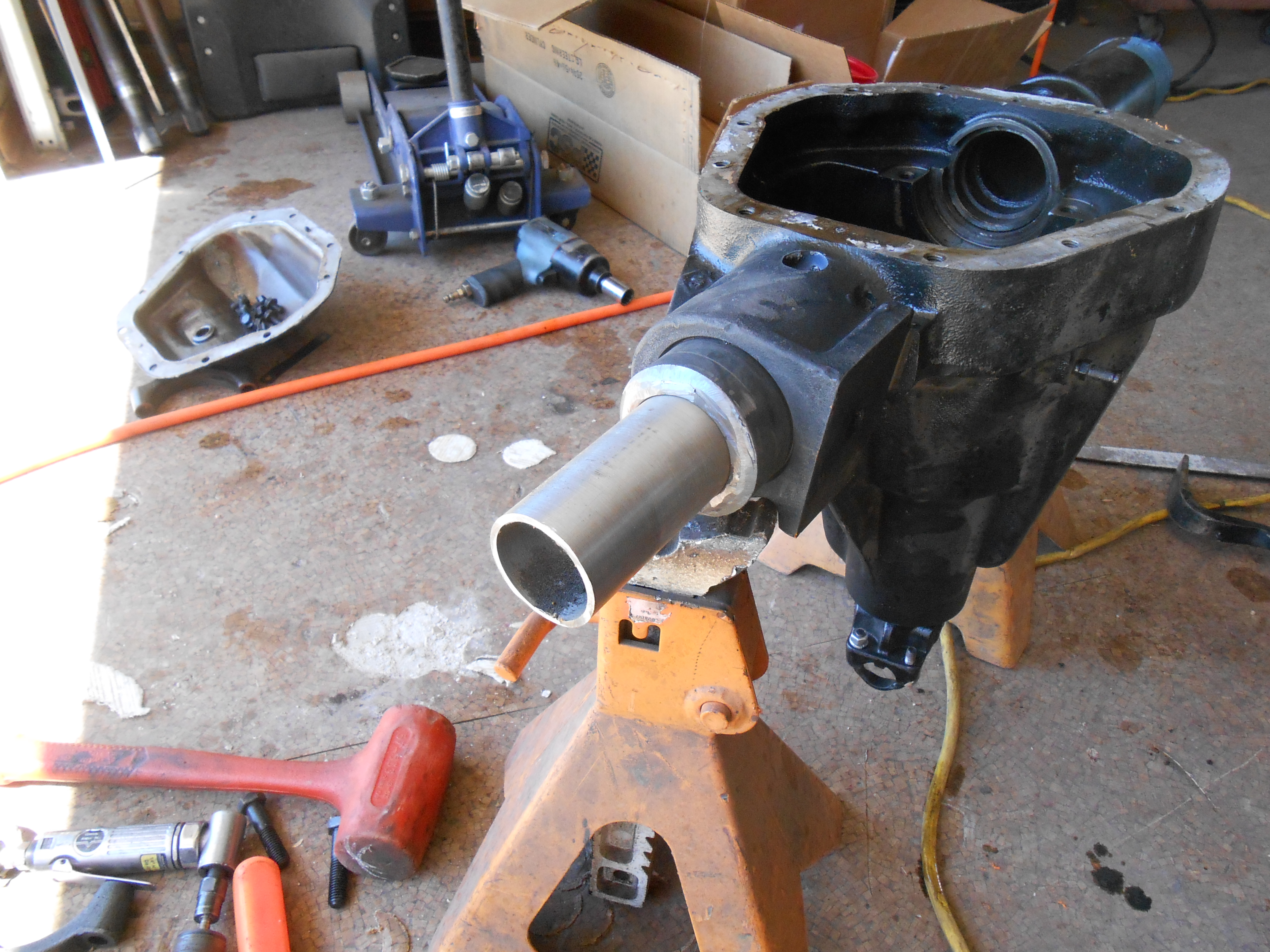 Got the axle all lined up and welded now for the artec truss. They don't make a truss for this type home made axle so I ordered a standard rear 60 and modified/narrowed it. You see the pic with the section cut out